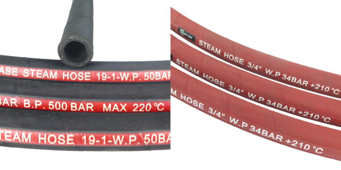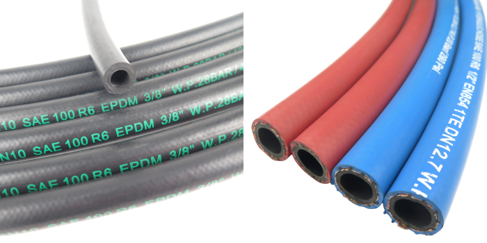 胶料: 内外胶层高强度EPDM橡胶,增强层为浸胶高强度聚酯线或钢丝增强层